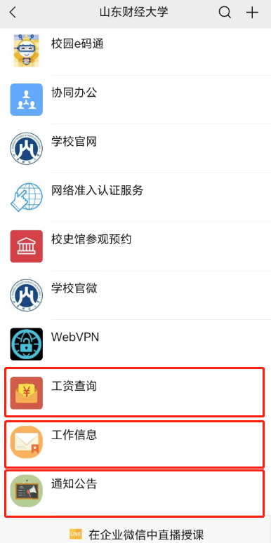 1、点击企业微信APP底部的工作台,分别点击工作信息,工资查询及通知公告可以进入对应的应用选项。