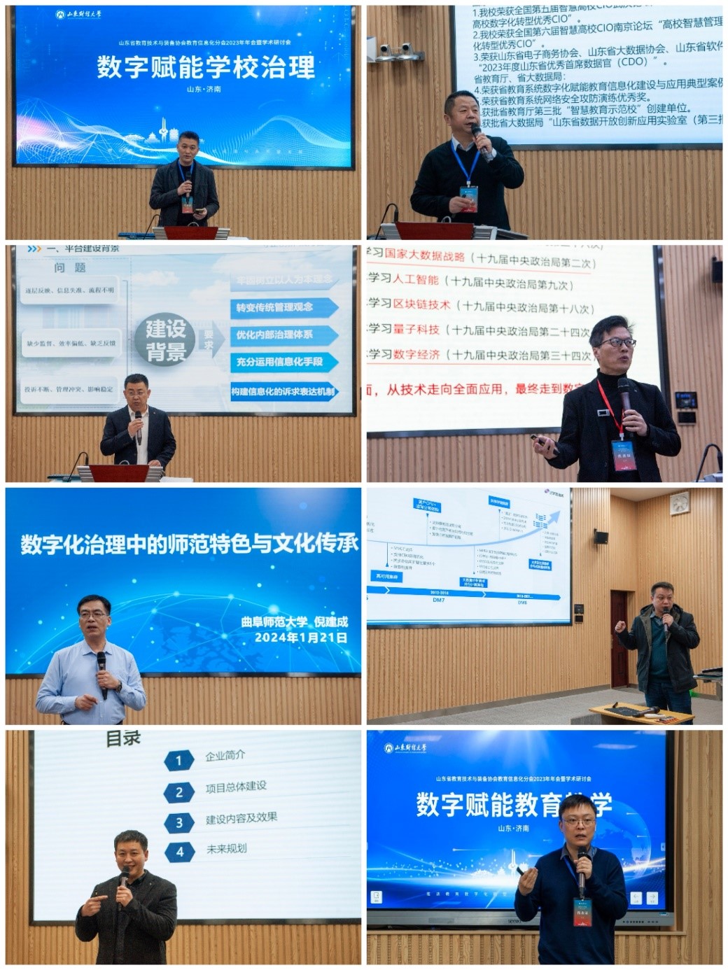 数字赋能学校治理分论坛中,山东中医药大学网络信息中心主任丁波、淄博师范高等专科学校党委委员组织人事处处长张兆坤、浪潮电子信息产业股份有限公司AI架构师李枞、山东建筑大学信息化发展与研究中心主任王兆文、武汉达梦数据库股份有限公司王坤、曲阜师范大学网络信息中心主任倪建成、山东省数字证书认证管理有限公司教育事业部总经理魏政、山东商业职业学院图书信息中心主任王伦生等几位高校负责人以及专家围绕数字赋能学校高质量发展、新技术应用探索、智慧教育应用创新等几个方面与大家做了深入的交流。