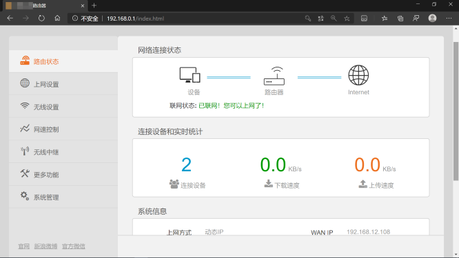 路由状态显示当前网络状态、能否上网、连接设备数、网络速度等。