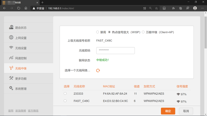 如果路由器信号覆盖范围小或信号强度弱,而刚好有另一个闲置的路由器,可以使用此功能将闲置的路由器作为副路由器对WiFi信号进行放大。把副路由器放置在合适的位置,选择主路由器的WiFi并输入密码,点击确定,副路由器会连接上级WiFi后重启。设置完毕后可以拥有两个WiFi,信号能够覆盖更大的范围。
