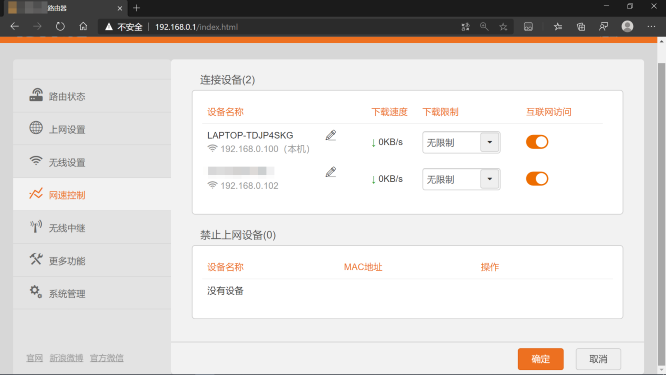 可以看到正在连接WiFi的所有设备,如果不想让某台设备连接,可以禁止其连接(加入黑名单)或对其进行限速。