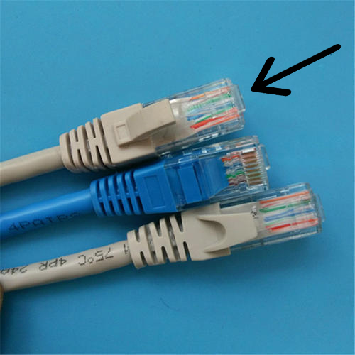 下图2箭头所指即为网线的水晶头,水晶头内有八根网线(如图3所示),颜色分别为橙白、橙、绿白、蓝、蓝白、绿、棕白、棕。